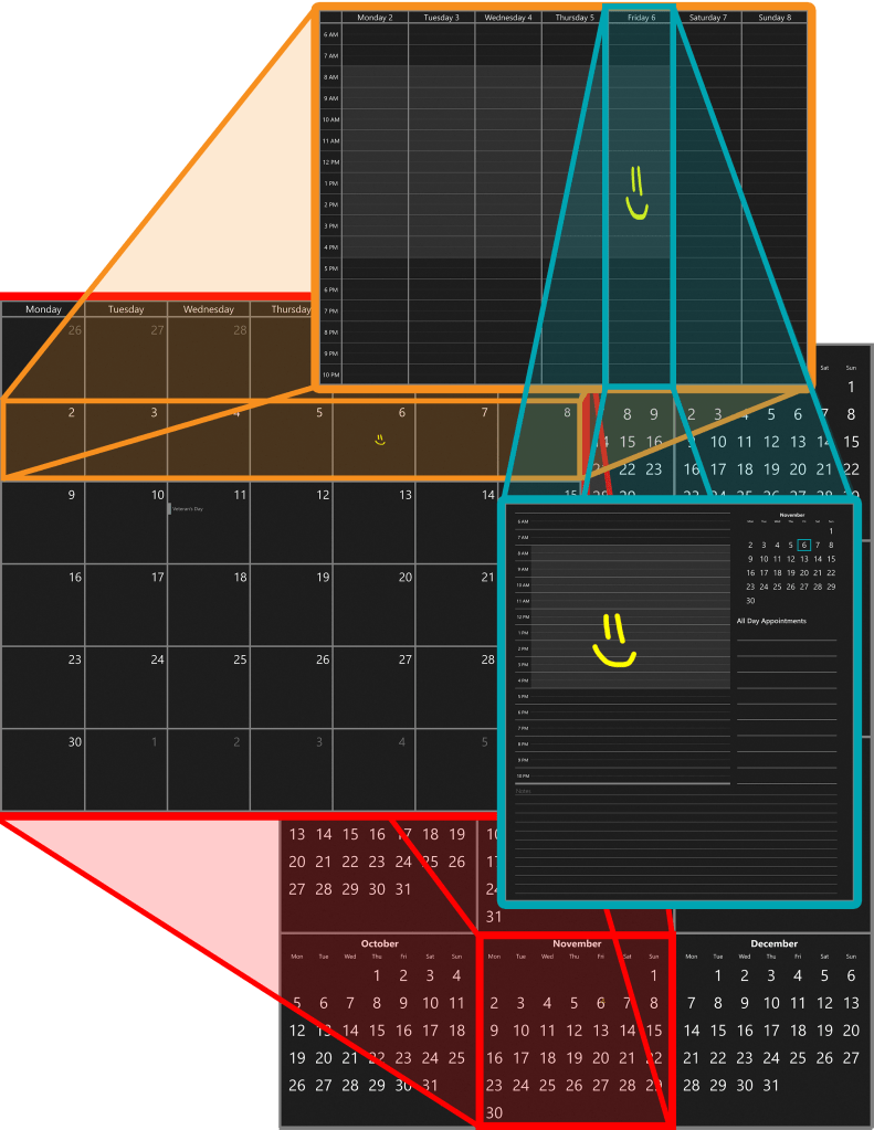 By these standards I have no need to see all of the different views overlapping each other. Generally I view Ink Calendar as a way to organize my thoughts and plans quickly and easily. When I need to share an event with someone or let it span views, then I add an appointment to my calendar.